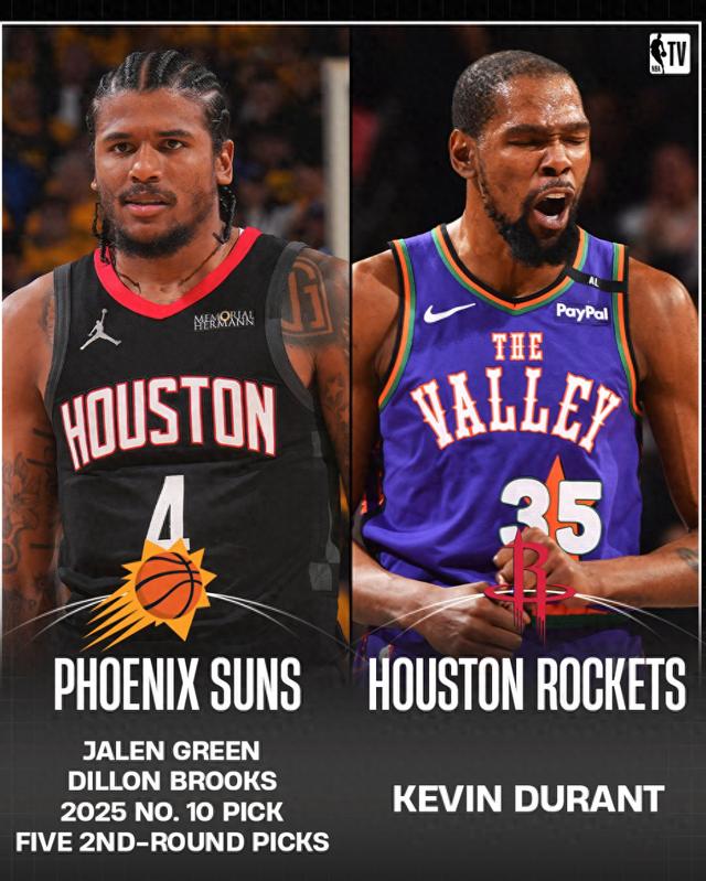 2025年夏进入休赛期以来最大的交易还是太阳与火箭,火箭送出杰伦-格林、狄龙-布鲁克斯、10号签、5个次轮签得到凯文-杜兰特,就连雄鹿裁掉利拉德的关注度都远不如太阳与火箭这笔交易,毕竟KD是联盟的天皇巨星。